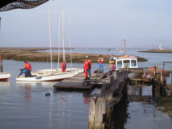 It all began when sleeping bag laden YHA's descended on an old moored light vessel at Tollesbury. Saturday dawned dull and misty- I couldn't work out whether the view from the ship was like being at the bottom of the sea or on a moonscape! After donning ourselves with 30+ layers we waddled along to our motor launches out to the Wayfarer sailing boats. After preparing the boats we floated around in search of any wind, still the sun bathing was good, especially on Mersea island. In the afternoon the wind turned up and demonstrated its force by causing booms to hit Trevor and I over the head!! In the evening nearly all of us descended on the local boozers for a refreshing drink and tales of the sea!! Sunday dawned breezy, so Dave, Alison and I voted with our feet for a lovely educational walk around the spit. We even passed the site of a Victorian pier. What a pity Tollesbury did not become another Southend! See Dave for excellent bird pictures. All in all it was a great weekend and so near home. The light ship was well accomodated and the food excellent. They even supplied enough custard for Trevor! Thanks Nigel! Roz Owen