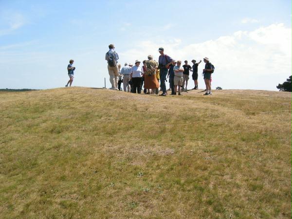 A Snake in the Grass Our walk back from Snape Maltings to Blaxhall hostel resulted in an interesting encounter with some local wildlife. In the middle of the road, begging to be run over, was a beautiful grey snake, about 40cm long, with distinctive yellow patches at the neck. After much discussion we decided it wasn't an adder, but weren't quite confident enough in our diagnosis to try picking it up. Luck for us! This native grass snake may not have poisonous, but apparently can defend itself by emitting a foul smelling pong. A few pokes with John's walking pole sent it slithering back to the safety of the grass verge. Sutton Hoo Ship Burial