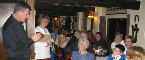 After getting back to the hostel we set out for the pub. Claire had worked hard to decorate it with streamers and 'Happy Birthday' signs. Our fare was shortly served and truly table strained 'neath loaded platter. Wine flowed, and then a very tasty afters. At close, Ian thanked everybody for coming and opened his presents, which had a railway-air to them. We left the pub around closing time and walked straight (or perhaps not so straight) back to the hostel. On Sunday we had a walk above Goring. The weather remained good and we were able to take refreshments outdoors in a local hostelry on the route. A very pleasant weekend and one which shall be remembered for a long time. John M