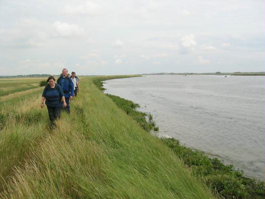 I personally enjoy walking besides water, be it sea or rivers, and over the years have walked much of the footpath that follows the sea wall of the River Crouch. But there was just one stretch I hadn't completed - the bit to the east of South Woodham Ferrers, so in order to satisfy my curiosity I suggested a walk that would take in the mudflats and creeks around Stow Maries. It was a hardy few who joined me and set out under grey skies and drizzle. We followed the track of the disused railway that used to run between S.W.Ferrers and Maldon. Then there was a stretch of field path, extremely overgrown with a treacherously broken stile to negotiate, before we dropped down onto the sea wall for unbroken views of mudflats and incoming tides. The rain eased and we decided this was the perfect time to have our picnic, sitting on the riverbank watching the boat traffic and the antics of the water-skiers. The weather improved as the afternoon wore on and sun made a brief appearance as we neared the walk's end, at Marsh Farm's well-stocked teashop. Thanks to new member Dave, who treated us to tea and cake all round. Marion Mike chose the right evening for his cycle ride around Billericay and Stock - one of the few dry July evenings! Not having cycled anywhere for months I found it a bit of a struggle keeping up with Mike (who was just back from his high-altitude training in the Alps) and Marion (who'd recently completed a charity ride). And to add to the humiliation, there was a cycle race taking place so we had brightly-coloured "professional" cyclists zipping past at incredible speed! Dave P Robert's Magic Waterproof Trousers Fear not when storms approach, Dread not the darkening clouds. Make Robert keep his trews on And sunshine will abound. Forbid him take them off Don't let him pack away. For these trews are truly magic And ensure a sunny day. Just don't let him get the sun cream out. Ali Country Walking Group of the Month If you read Country Walking magazine you might like to look out for the September issue (published 20th August) which will be featuring Chelmsford YHA as "walking group of the month" - stand by for an influx of new members!! |