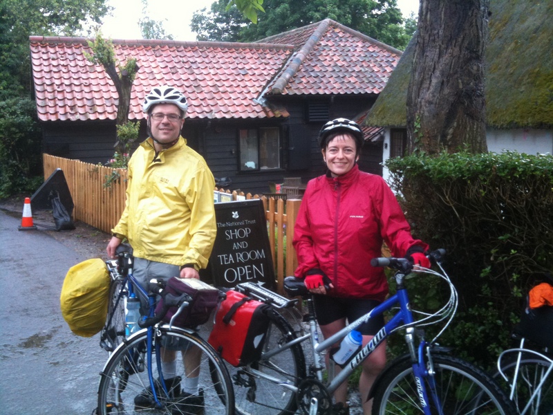 We de-camped to Dedham, unloaded the bikes and immediately donned the waterproofs. The rain had eased a little, but it was still coming down at a fair rate. We started pedalling, but the wet and steamy weather rapidly made my glasses a little pointless. It was a fun ride. The scenery was still gorgeous, but some of the roads were flooded and it was difficult to gauge the depth of the water without sending a sacrificial cyclist through to check. We each took it in turn to be dipstick.