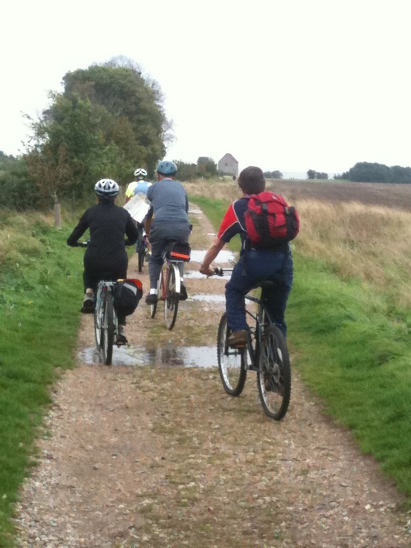 Thank you Doug for organising an interesting cycle ride round the Dengie peninsular. We met at Southminster railway station as planned, although numbers were modest thanks to a less than promising weather forecast. It was dry at 10:30, so the five of us decided to set off straight away to try and get as many dry miles under our belt as possible. The first village was Tillingham, which made a convenient loo stop, then we continued on to Bradwell. We could have paused here for a beer, but we were very conscious of the glowering clouds, so we only stopped long enough to pick up Doug’s previously deposited cycle helmet before pressing on to St Peter’s Ad Murum at Bradwell. St Peter’s is probably the oldest church in the country and it’s certainly a very atmospheric place. Whilst the cycle ride would have been nicer in blazing sunshine, it has to be said that the stormy clouds did lend the place a certain something!