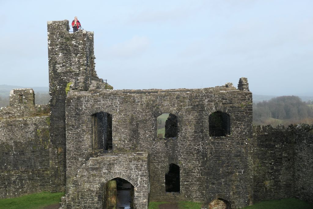 In the grounds of Newton House lie the ruins of Dinefwr Castle. Once the seat of the Kingdom of South Wales, it is now a romantic ruin high on a rocky outcrop surrounded by trees. The Barons Dynevor claim to be descendants of Rhys ap Gruffydd, also known as the Lord Rhys. Back in the late 12th century the Lord Rhys was busy setting up a kingdom in South Wales. To do this not only did he have to battle with the Normans, but also his neighbouring Welsh Princes. The result was a strategic rash of castles with huge views and defendable positions. Dinefwr was the home seat, and certainly held a commanding position overlooking the valley. From the battlements you can make out the outline of a neighbouring castle at Dryslwn. Not that there was anything dry about it the day we visited. By their very nature all these castles are at the top of steep slopes and the recent rain had left the grass slicker than the accounting for Boris’s no.10 apartment decorations. If Dryslwyn was slick, Carreg Cennen was even more slippery. Admittedly we chose a wet day, but you really needed to use a stick to stay upright, as Judi discovered in the first few yards. Our walk at Carreg Cennen took you round the base of the rocky outcrop and across the valley to gain magnificent views of the castle ruins. The castle is probably the most photographed in the area due to it’s dramatic position high up and over looking the River Cennen, but sadly our views were denied by the weather gods who shrouded the scene in a heavy mist. Luckily Dave and I got the full view a few days later when we did the 6 cairn ridge walk in the Black Mountain. We managed to bag three of Lord Rhys’ castles, but there were many more. Along the coast there are Laugharne, Kidwelly and Llansteffan, all offering views over Carmarthen Bay. And of course Carmarthen Castle itself, although I think it’s been done up a bit since Rhys’ time. Plenty of material for a future return trip.