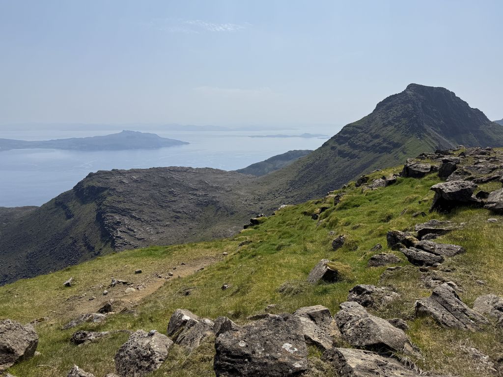 Next day, better than forecast weather led us to discard our plan for a warm-up walk to the coast for a full-on mountain adventure to conquer the Sgurr of Eigg. This is the most distinctive feature on Eigg, and can be seen from miles away. It’s a big lump of basalt thought to be the remains of an ancient pyroclastic flow from Skye. From the front it looks sheer and impenetrable, but from the back there is an easy scrambly route up. At the top you could see for miles: Rum, Skye, Knoydart and the mainland.