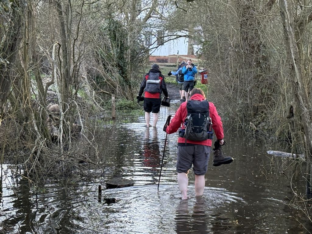 After a reviving drink and the temptation of a bowl of chips it was time to complete the last part of our walk – 2 miles along the side of the river. All along the path we could see evidence of the winter flooding with debris in the meadows and meshed into the fences. We had almost got all the way back and were congratulating ourselves on a lucky escape when we encountered water on the path. River water. It was a only short stretch – we could see the other side – but there was no telling how deep it was. Heroically we sent Owen ahead to test the depth. It was deep, but to retreat at this stage would mean a good four mile round trip. So off came the boots and socks, trousers were rolled and slowly we waded through the mucky water. Sadly, it was stony rather than squelchy (Ow! Ow!) but enough river mud to justify careful wiping before reassembling our footwear on the other side. Not far from here back to the hostel, a hot shower and a delicious Thai curry from Chris.