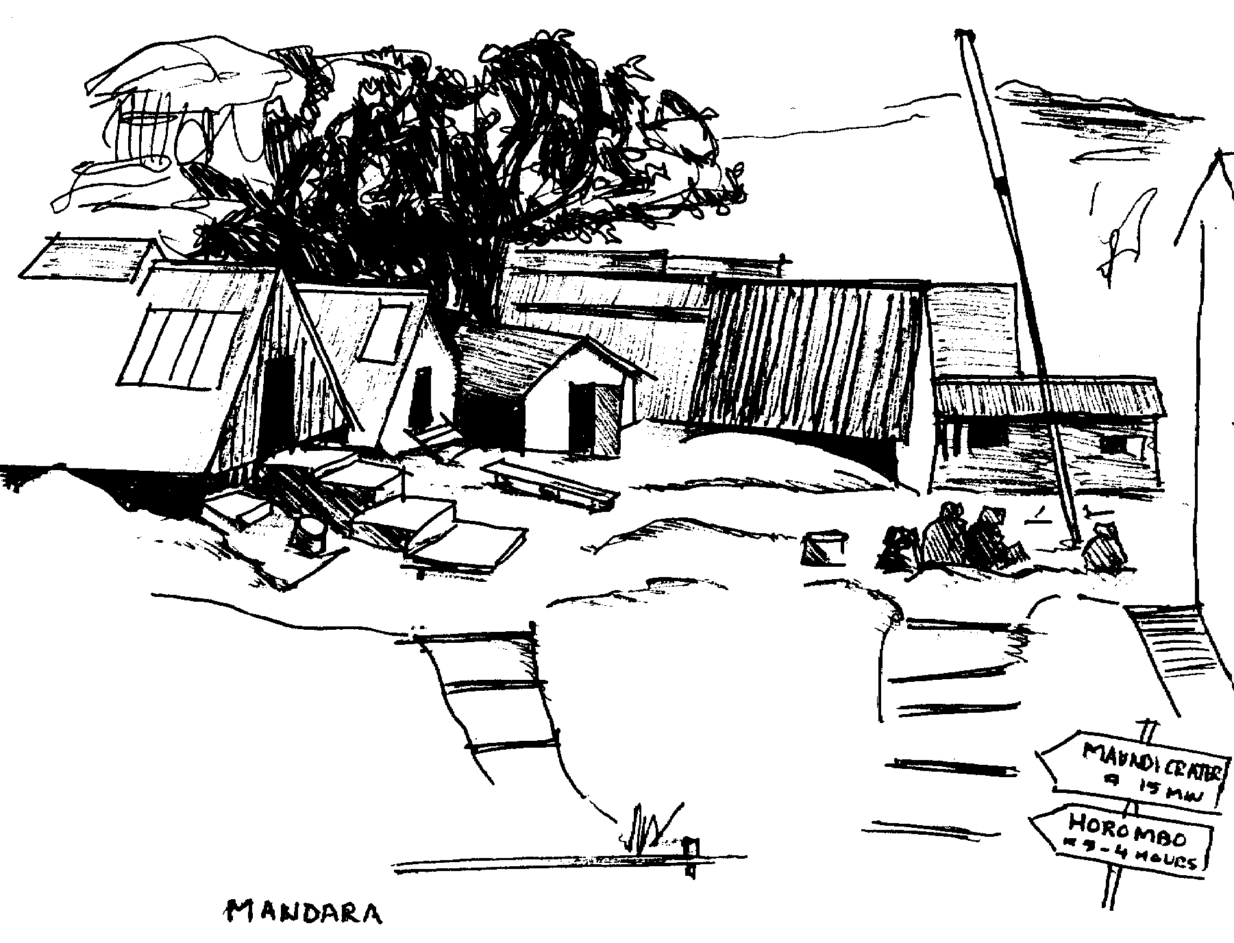 I have joined a group of seven to climb the highest mountain in Africa. A squat minibus takes us to the Mountain Inn at Moshi. The tarmacadam road crossed dusty plains. Women dressed in Kanghars loosely wrapped and brightly coloured balancing water containers on their heads strode along the roadside. We overtook trucks belching black smoke, the occasional cyclist and the odd man pushing a timber barrow. Scattered along the roadside were small farmsteads, single storey shacks with corruga ted iron roofs and blockwork walls, some rendered, some not. A police road block manned by armed officers slowed the traffic. We drove on through. After an hour we came to the hotel, set back from the road and approached via an earth track which lead on up a rise to a village out of sight.