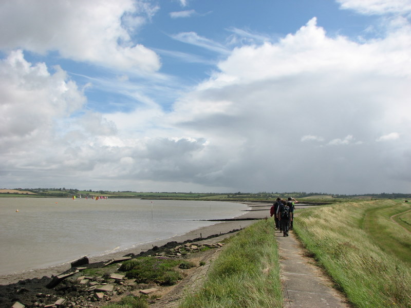 Biking in Suffolk Thanks to Jim for finding some particularly fine routes for our cycling around Blaxhall. One of the highlights was taking our bikes on the smallest registered ferry in Europe (a rowing boat across the Butley River). The weather was beautiful, perfect for cycling along dappled rural lanes and relaxing outside quaint country pubs. There might even have been a tea room or two. Roaching in the Rain Not to be put off by a rather dismal forecast, five of us turned up for the first half of the Roach Valley Way. We started from Canewdon with beautiful views from the hill top churchyard, but very shortly we were donning waterproofs which were to stay on for the rest of the day. Sunday we were joined by another five souls and a bit more sunshine. Entertainment was to be had watching Mike struggle into his new waterproof trousers, but we sheltered from the worst of the showers in a Paglesham pub. I don’t know about a “Roach Valley Way” badge – a medal for completion, perhaps? |