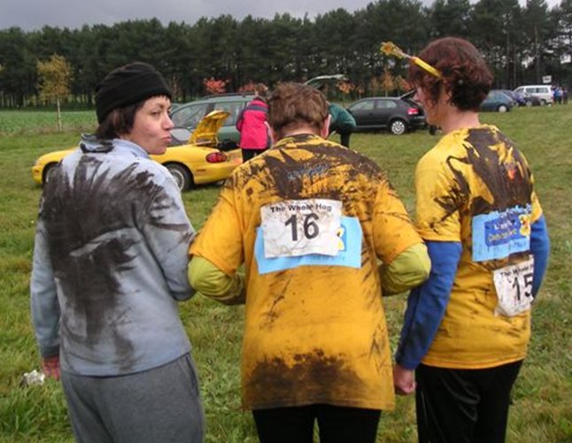 Our more cautious team set off over a large mound and immediately sat down going down hill! It really was a wonderful area with mature oak trees clad in their autumn finery, bordering Rendelsham Forest. The focuused adventures noted lots of wonderful fungi along the route. After 1km the team met with their first water WATER? Challenge. Hmm all thought this was an assault course? Rather they heard participants going through this challenge well before they reached it! They had to climb down a steep bank and walk along a stagnant thigh deep river underneath a bridge with flotsam passing them by. Note that these three had to tackle these challenges after about 180 people had gone through, muddy was not the word. Who suggested that Roz wore walking boots rather than running shoes??? The Wild Women chatted to various other competators along the way including a team from the British Legion. One of their members was 77! Somehow this team managed to complete the race before the Wild Ones!!! The rest of the 8 miles became rather a blur. They largely consisted of crossing a river then jogging to dry out and then meeting another water challenge. At one point The Wild Ones came upon a challenge where they had to cross a river on aircraft fuel tank pontoons and return though the water. They had to go under some decking with only approximately 15cm between the deck and water. The only way to get through was to tilt the head sideways. Fay decided instead to practice snorkelling without a snorkel! Others involved ropes and deep water. Some required swimming over, others balancing on rope!! Fay learnt to catch flies on the way over one river. Our brave fools tackled all the challenges and did not choose the piglet (easy) options! All along the way Fay and Roz thought about Rachel and how it was the type of challenge Rachel would have chosen. The Wild things completed the race in 2 hours and 47 minutes, not bad at all! Even if the prize giving was over and the only applause was from the children of the organisers! Please note that Roz still wore the Marie Curie daffodil headband at the end. The discreet ladies peeled off all their items of clothing in a toilet using numb fingers. Fay sported a lovely number around her legs in the shape of a towel! They celebrated with cups of red bush tea and Waldys delicious Polish apple cake. Yum food never tasted so good! Baths that evening were very welcome for all concerned. Roz spent about 5 minutes trying to get the mud out of her hair. All felt proud of them selves and know that his would have brought a smile to Rachel’s face! Thanks to all who have sponsored our team. |