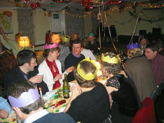 The splendid weather at the beginning of our stay was never very likely to last and, true to form, it deteriorated as the week went on.. By New Year's eve it was still freezing cold, but with low, darkening clouds getting more threatening as the day wore on. It started snowing as we were preparing dinner - a few pretty swirling flakes at first, then getting heavier as it started to settle. By the end of dinner there were a good few inches down and it was icy cold, so we were very glad of our toasty-warm bunk barn to retreat to. Party preparations were well under way with a substantial drinks table, snacks and nibbles, and Jim's quality sound system primed and ready to go. Then at 11:30, just as the party was warming up, poof! We were plunged into darkness! After a moments hesitation and mutterings of "oh,dear" and "a fuse, d'you think?", there was a general exodus as people went in search of torches. It didn't take long for us to find out it wasn't just us, but the farm and village were dark too (and about 50,000 other people in the North West, as it turned out). Needless to say this put something of a damper on the proceedings. Our hip, happening party became something of a Petzel-lit miners convention as we crowded round Colin's wind-up radio to hear the bongs. Alcohol consumption was definitely down. No one could see what they were drinking and there was an extreme risk of ending up toasting the New Year with a glass of Cinzano (yuk!). After a couple of rounds of Auld Lang Syne and some general party banter, people started drifting away to their cosy sleeping bags. It was left to a small hard core to sit in the dark and reminisce on previous New Year disasters (Fire brigade last year, no gas to cook on Millennium eve). What can we possibly do for next year? Many thanks to Farmer Neil and his wife for looking after us so well, and to the new landlord of The Craven Heffer who opened up specially to provide us with hot drinks on New Year's morning, in spite of having a pipe-bursting crisis of their own. Ali Sins of the New Year For anyone who has indulged the sin of Gluttony over Xmas, the New Year trip, in theory at least, is an opportunity to walk off the excess baggage. It does however encourage the sin of Envy, as people compare their Christmas presents, and become competitive about the features of technical clothing and gadgets. This year, it was Dave's robotic folding pen (which came out at suspiciously frequent intervals) - Waldy's new digital camera (which was apparently, better than Dave's) - John's interactive Buxton jacket (Christmas present to himself-) and Nigel's new trousers. This purchase was not necessitated by over indulgence at Christmas, but was due only to Nigel having excess wardrobe space in his new house. However, they did trigger an orgy of spending as others attempted to out-trouser him. Dave P raised the stakes with train-spotting trousers with interactive linings, which are too hot to walk in..(might they contribute to Sloth?), and Nigel then began to think seriously about a purchase of top of the range Paramo. He was last seen disappearing into the clothing shop in Settle, ostensibly to buy a present for Rachel...... Trudi Fire hits The Crown at Sandon Apologies to anyone who hoped to meet us at the Crown last Wednesday. Unfortunately this charming old pub had experienced a large fire and was missing much of it's roof (therefore not open to customers). We called everyone we could think of who might have been coming to relay the change of plan, but couldn't realistically call everyone. Indoor Bowls Many thanks to Marion for organising this event. Seven of us took part in a hard-fought competition of skill and determination, before one player emerged victorious! And very tasty those Smarties were too!