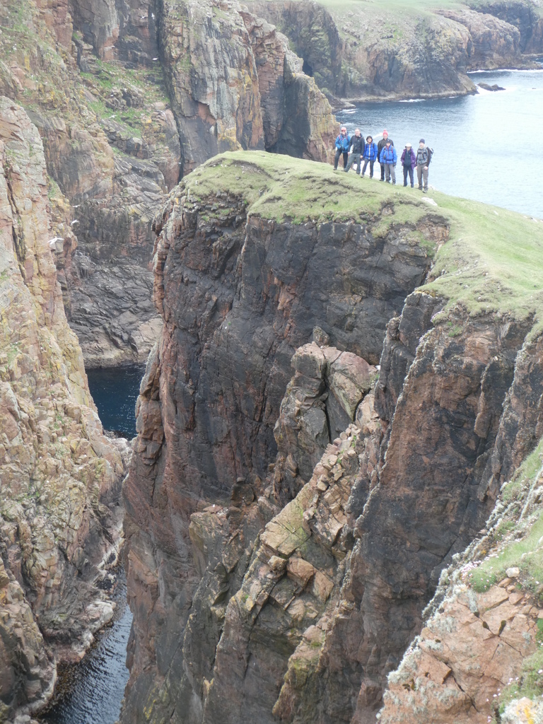All Hail, Shetland! It started in London when a small band of excited travellers gathered under the departures board at Kings Cross Station. There were a few who chose to make their way north by other means, but 8 of us were on the train. Stocked up with snacks and reading matter, we were geared up for a peaceful few hours chuntering up to Aberdeen – but it was not to be! Aside from our 8 seats every other seat in our coach was occupied by teenagers on a school trip from Dundee. They were well behaved, but it was not the quiet journey we were expecting! The last hour or so from Dundee was lovely, but the carriage looked like the aftermath of a pop concert, with overflowing rubbish bins and food all over the floor. From Aberdeen Station most of us trundled our luggage up the hill to the hostel, where we were met by John, Judi, Colin & Fergus, who’d driven up. The next morning we trundled back down the hill for a slap-up breakfast in Wetherspoons before shedding our luggage and taking a look round the city. The dockyard was dominated by the Northlink ferry, with its pointing Viking livery, that would take us north. About 12 hours north. It’s hard to believe there can be 12 more hours north after all that time on the train, but this is Shetland – more Viking than Scottish! For personal reasons I shall gloss over the pitching ferry ride, as I spend most of my time lying very still and trying not to think about the swell. However I woke up the next morning to find that we had indeed arrived in Lerwick. I declined the full Scottish breakfast, but they were very popular with the rest of the team. Luggage collected, we leapt into our hire vans and drove out to Bridge End on Burra, and the activity centre we were staying at. A former school, it was set on an island accessible only by boat before the bridge was built. That’s one way to stop the kids escaping! We spotted our first otter as we were unpacking the Tesco’s shopping over a cup of tea. Over the week of our stay we travelled the length and breadth of Shetland, and I can’t go into detail of every walk and trip. There were ferry hops to the islands of Yell, Unst, Mousa, Fetlar and Out Skerries. The cliff top walks were so stunning it seems criminal not to mention them, but they were simply all good – Eshaness, Muckle Roe, Silwick – which would you pick? Towering cliffs, stacks, pinnacles and arches. Soooo many seals. At Fethaland I spent a good 20 mins watching seals swimming below me in water so clear you could watch them diving under the surface. Along with the seals, otters and other wildlife, there were just so many birds: the smokey-eyed fulmars, the glossy shags, bully-ish skuas and elegant diving gannets. I must also mention the Neolithic remains: Mousa broch, Jarlshof, the Ness of Burgi. Seriously, a week is just not enough! I took the headline from our day walking from Quendale to Fitful Head. Like most of our days in Shetland, it started sunny but as soon as the wind picked up you were wearing every layer you had. This was what it was like walking from the shelter of Quendale bay up to the cliff tops and into the teeth of a fresh westerly wind. All along the cliff top was a turf bank designed to protect the grazing land from salt spray – and we were about 900ft up! At the top we hopped over a fence to find a bit of shelter for lunch – this was in the lee of the radar building. As if to prove how cold it was at this point it started snowing, but luckily not for long. Between wintery showers there was glorious sunshine with which to admire the view down to Sumburgh Head and out to Fair Isle, and for clarity these were probably our best views of the week. We returned to Quendale with minutes to spare, sheltering in the old Mill with a cup of tea whilst listening to the hail drumming on the roof. This is summer in Shetland. Ali Ever Decreasing Boats in Shetland As well as the overnight car ferry from Aberdeen to Lerwick, the smaller inter-island car ferries and a replica Viking longship on Unst, Colin, Robin and I took the the smallest boats of all, sea kayaks, to paddle from Scalloway the 7 miles back to the Bridge End Outdoor Centre. We launched at Scalloway in sight of the castle, and immediately met 3 red-throated divers. Our voyage took us down the sound between Mainland and Tronda, then down to East Burra. On the way, we passed the Shetland mussel farms, followed a razorbill, posed with Shetland ponies, and visited a tern colony without getting bombed as they're not bothered by boats. The highlight was the Bridge End Centre's resident otter swimming along in front of my bows. Jim |