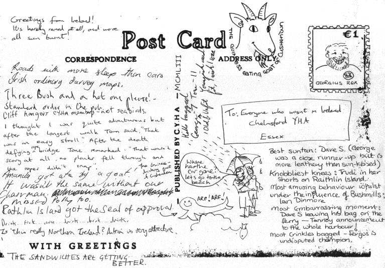 Giant Postcard from Ireland We're just back from an excellent week in the north of Ireland, exploring Donegal and Antrim. Cliffs, beaches, mountains, bogs, islands, Guinness, whiskey, and sunshine! More next month, but for the moment, see the giant postcard and some pictures. |
