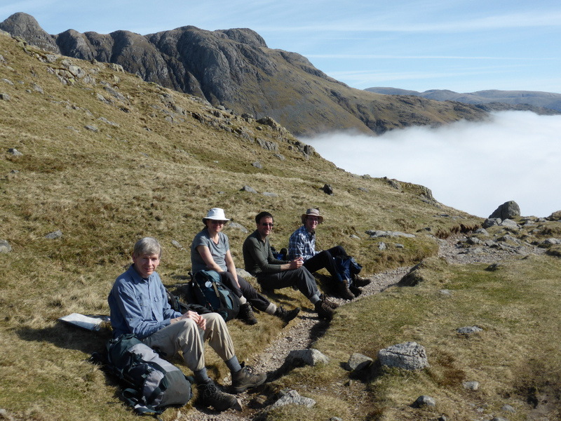 To Loughrigg and Beyond Good Friday saw slightly less than great weather. It rained pretty hard overnight and was still a bit damp in the morning. Around 10ish we set off from Rydal Hall across to Rydal Water and on to Loughrigg Terrace. Although the cloud rose throughout the day, it stubbornly clung to the tops of the higher peaks. From Loughrigg Terrace we climbed up to Silver How, higher, but still below the bulk of the cloud. From here we could see views of Grasmere and Rydal Water swirling in and out of the cloud. Next it was down to the bright lights of Grasmere Village for some tea and cake before the walk back to the centre. Not too wet, nice views, and a teashop - and this was the worst weather of the trip. How lucky can we get? As it turned out, much luckier than that. Saturday saw a party of 8 set out on the Langdale Circuit, while the rest of us headed up hill to tick off the Fairfield Horseshoe. It was a pretty decent start to the day and the weather just got better and better. Fairfield was garlanded with beautiful snowy cornices and from the top it seemed like we could see the whole of the Lake District. By the time we got back to the centre the whole of the valley was bathed in golden evening light. Easter Sunday had a thick, misty start. Fuelled by the promise of a good forecast and a Crème Egg, we split into two groups: Cress led a team up Wansfell; and Dave led a group up the Langdale Pikes. Both groups ascended through the mist and were treated to views over the tops of the clouds. The sun was out and climbing was hard work. Come the evening and there were several red faces around the dinner table – largely those who’d forgotten their sunhats and suncream. Monday saw us fracture into three groups and some were heading home. Weather-wise this was possibly the best day yet, provided you could get above the blanket of cloud. I’m not sure that the Loughrigg Fell party had the views until much later, but the team ascending Bow Fell had spectacular views from 11am onwards. And they really were breathtaking. What a fabulous trip. Ali Toad of Rydal Hall So why did the toad cross the road? Judging by the one we saw at Rydal Hall, he was making determined progress towards the pub. However John & Judi had seen dozens of them up by Alcock Tarn, getting busy with the season, so perhaps it was just the start of a very long walk. Or perhaps he’d heard about the badger-spotting opportunities in the pub car park? Prof R J Gumby There was a surprise visit from Prof R J Gumby during our walk up the Langdale Pikes. There was much grumbling, but never once did he say his brain hurts. Next time, Doug, bring a sun hat. Temperature Inversion Our trip to the Lakes was rewarded with the most excellent weather. Apart from Good Friday, the weather every other day was clear and on Sunday, Monday and Tuesday was positively summery. Clear, starry nights resulted in cold, misty mornings as the cooled air became trapped below a blanket of warmer air. This made setting out in the morning a rather cold and dull affair, but within about an hour of walking we had the pleasure of emerging above the cloud into a heavenly world of sunshine and expansive views. Mountains appeared above the clouds like islands in a fluffy sea of white candyfloss. The most magical views. |