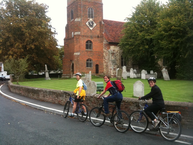 Thank you Doug for organising an interesting cycle ride round the Dengie peninsular. We met at Southminster railway station as planned, although numbers were modest thanks to a less than promising weather forecast. It was dry at 10:30, so the five of us decided to set off straight away to try and get as many dry miles under our belt as possible. The first village was Tillingham, which made a convenient loo stop, then we continued on to Bradwell. We could have paused here for a beer, but we were very conscious of the glowering clouds, so we only stopped long enough to pick up Doug’s previously deposited cycle helmet before pressing on to St Peter’s Ad Murum at Bradwell. St Peter’s is probably the oldest church in the country and it’s certainly a very atmospheric place. Whilst the cycle ride would have been nicer in blazing sunshine, it has to be said that the stormy clouds did lend the place a certain something!