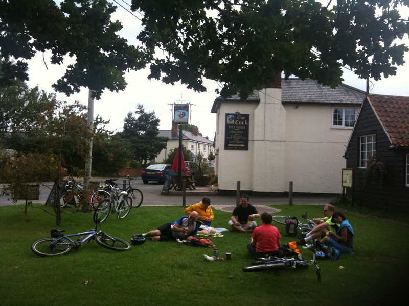 August Cycle Ride It was a lucky 7 met in Thaxted at the start of our 20 mile cycle ride. The first stop was the picturesque village of Finchingfield and its equally picturesque tea rooms. It was teas all round and Mike partook of fullest full English I’ve ever seen – fuel for the journey ahead. By this time we’d not gone very far, we were loaded with excess calories, and it was already midday. Pressing on, we sped through the villages of North Essex (hilly!) and nudged up into Cambridgeshire. Lunch was at Castle Camps, dining on the green next door to the pub. As elevensies were at twelve, it was no surprise that we weren’t ready for lunch until three. Luckily for Carol (who’d forgotten her lunch) the pub was still serving and presented a succulent-looking beef sandwich, complete with place setting and knife & fork. Never has a picnic looked so posh. The last leg of the journey included yet another opportunity for nosh as we passed through the village of Ashdon. Ashdon boasts a very fine local museum, run by volunteers and a team of tea-cosy knitting ladies with a fine line in home baking. Some of our cyclists also rounded off the day with a pub meal in Thaxted. I strongly suspect that we ate more calories than we burnt off, but at some point the route stretched from the advertised 20 miles to nearly 40. A weekend away... in Chelmsford Often walking near Chelmsford, we’ve come across waymarks for the Chelmsford Centenary Circle, and I’ve been curious to know where it went. So when Dave and Helen offered to lead an expedition around the Circle, we had a chance to find out. The 22-mile Centenary Circle was set up in 1988 to mark 100 years of the Borough of Chelmsford. Starting in Springfield, the first part of the route along White Hart Lane and past Sainsbury’s didn’t seem very exiting, but we soon dived off down a footpath I’d never noticed before, passed under the A12 and found ourselves on the familiar path beside the River Chelmer. Via Sandford Mill, we came to Sandon for lunch on the village green and a pint at The Crown. After passing through Great Baddow, we were off across the fields for the most scenic part of the day to Galleywood. We broke the route for curry, beer and a night’s sleep. Carrying on next day, from Galleywood Common, we crossed the Wid Valley and into Hylands Park (ice cream stop), and then on to Writtle for lunch. Next, heading north, crossing the river Can, skirting around Melbourne to Broomfield (pub stop), across the Chelmer valley, through the fields around New Hall to Beaulieu Park and back to Dave & Helen’s for more tea and cakes! Altogether, a thoroughly enjoyable weekend, and fascinating to connect such familiar places with unfamiliar footpaths through some very pleasant countryside. Dave P Dining at The Duck Thank you Cress for organising a lovely evening with ten of us for dinner at the Duck in Newney Green. It was lovely to have Doug back with us after his accident a few weeks ago, though I’m not sure the other diners would agree. The graphic description of his face-off reconstructive surgery sounded more like the plot from a Tarantino movie than suitable dinner conversation. More raspberry coulis with your sundae? Ali |