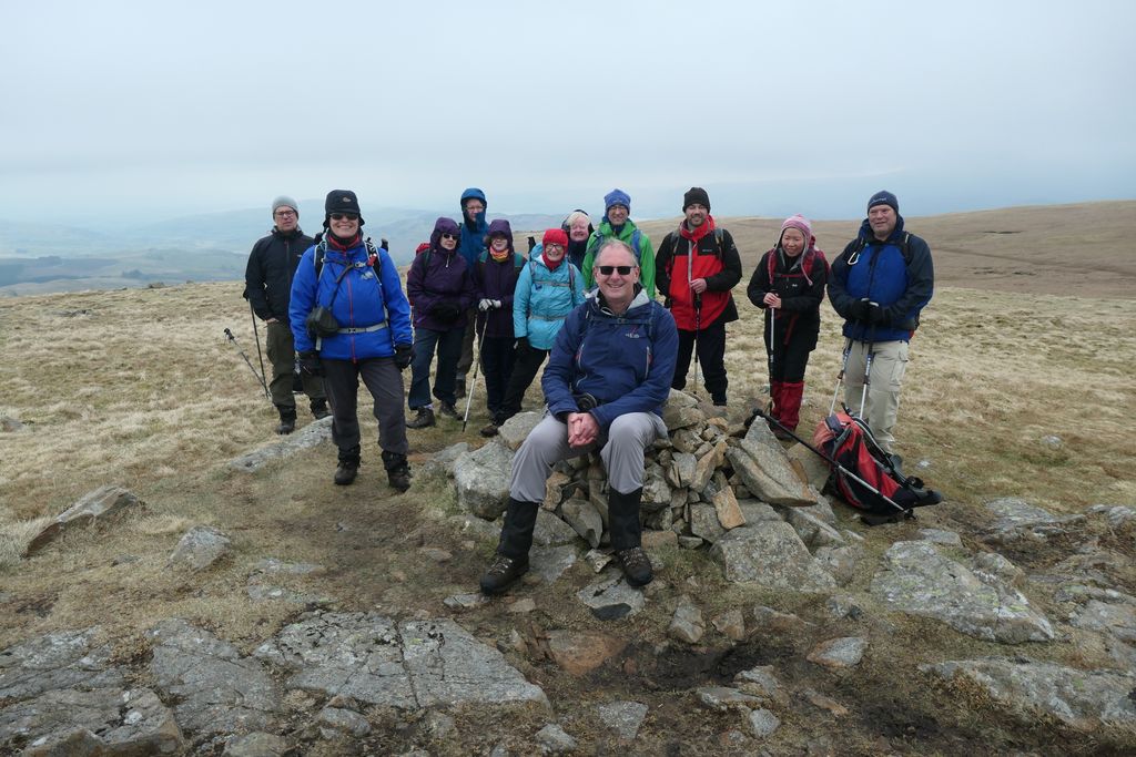On day 2 we headed up Hart Side and on to the Dodds. As this was Dave’s last Wainwright, there was a good turnout on the walk. From the car park we squelched up the valley through a series of slithery bogs before emerging on Birkett Fell at the start of the ridge. At this point the weather was still a bit hazy, so the less-dedicated decided to turn back after Hart Side. To be fair it was rather chilly, but I feel they did all the hard work but missed out on the reward. On the col below Stybarrow Dodd we sat down to enjoy lunch and slowly the cloud lifted. Still freezing cold, but freezing cold with a view! By the time we passed the summit shelter on Great Dodd it was full sunshine and the views were sensational.