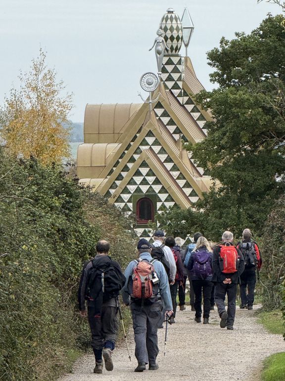 By contrast our walk on Saturday took us past an equally decorative, but starkly modern building – Grayson Perry’s “A House for Essex”. We took the train from Harwich to Wrabness and the footpath linking to the Stour estuary went past it. The house was completed in 2015, so we missed it when we did the Essex Way in 2010. This eccentric house features a distinctive exterior with bespoke ceramic tiles, a golden copper alloy roof, and eye-catching sculptures. It is designed to look like a miniature chapel and is intended to explore the history and character of Essex through the life of Julie Cope, a fictitious Essex 'everywoman'.