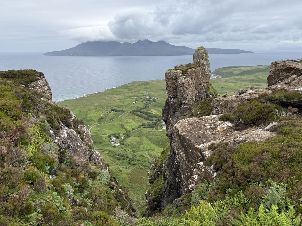 Next day, better than forecast weather led us to discard our plan for a warm-up walk to the coast for a full-on mountain adventure to conquer the Sgurr of Eigg. This is the most distinctive feature on Eigg, and can be seen from miles away. It’s a big lump of basalt thought to be the remains of an ancient pyroclastic flow from Skye. From the front it looks sheer and impenetrable, but from the back there is an easy scrambly route up. At the top you could see for miles: Rum, Skye, Knoydart and the mainland.